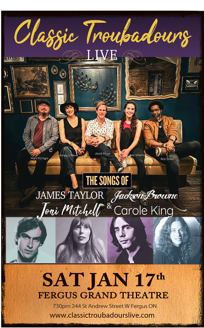 Classic Troubadours is an extraordinary musical journey that celebrates the timeless songs of James Taylor, Joni Mitchell, Jackson Browne, and Carole King. Performed by a talented 5-piece band, this tribute goes beyond imitation to honor the artistry of these legendary singer-songwriters. Featuring heartfelt renditions of beloved classics like "You've Got a Friend, "Big Yellow Taxi," "Running on Empty," and "Carolina in my Mind," the show brings the nostalgia & magic of the 70's to life. With warm, authentic performances and rich storytelling, Classic Troubadours Live is more than a concert - it's a heartfelt tribute to the music that defined a generation.